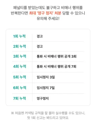 영구정지 : 규칙 위반 점수가 7회 이상 누적될 시 계정이 영구적으로 정지되어요!
